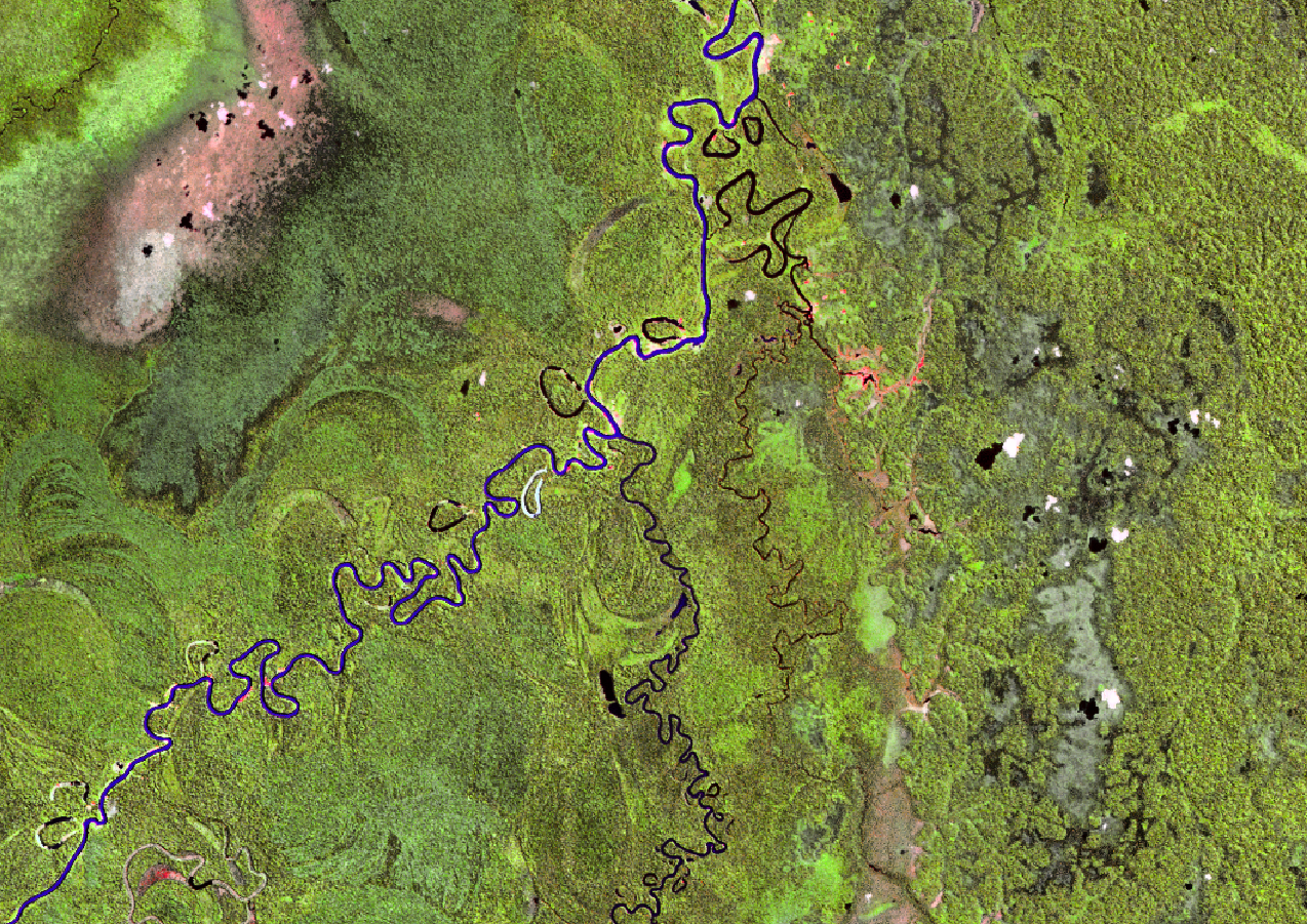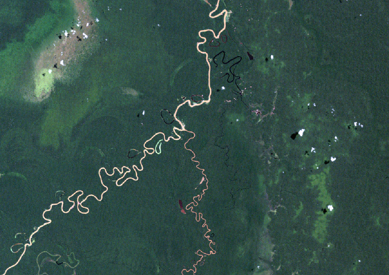 This image from the upper Amazon basin in Peru is a useful example of how multispectral image combinations can highlight different terrain features. The image on the left is a 'natural color' combination, while the image on the right is a 'false color' combination. Use the slider feature to compare how forest and water features appear in the two images.